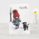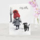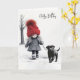 A cartoon drawing of a young girl wearing a large 3D red knit hat with a pompom walking with a black dog.