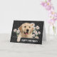 Cute golden retriever with white daisies on black and white polka dot pattern for any age birthday.