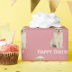 Happy Birthday golden retriever wearing black-rimmed glasses on blush pink background.