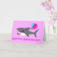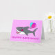 Greeting card with cute shark with pink flower holding party balloons in pink, purple and turquoise colors. The text says "Happy Birthday!" The design is customizable and you can personalize the text.