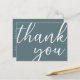A slate grey background. On the front large hand lettered script with the text: Thank You. Back: Template for your Thank You note and name/names. Tip: If you don't want it to look like a postcard, click customise, go to the back and remove the divider and post stamp.