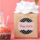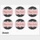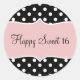 Pink, black, and white happy birthday sweet 16 sticker labels in a stylish and trendy cute design that includes black and white polka dots and an emblem you can personalise online that says Happy Sweet 16