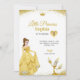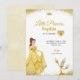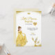 Birthday invitation featuring a princess in a yellow gown and a candelabra character. Text reads, "Little Princess Sophia is turning five," with elegant gold accents.