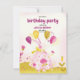 A cute rabbit in a fluffy pink dress with flowers and balloons. A birthday invitation for a girl in pink and yellow shades. Illustration with grainy texture and pencil texture.
