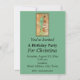 This party invitation is green with a framed image of a lady wearing a mint green hooded gown sitting in a golden snow covered tree. Customise your information with the templates.