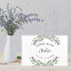 A stylish white background decorated with violet lavender flowers and eucalyptus greenery. Personalise and add a name.