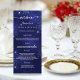 Birthday party menu card. Personalise and add a name, age, date and the menu. A navy blue background, decorated with faux glitter dust. The blue colour is uneve. White coloured letters.