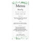 Birthday party menu card. Personalise and add a name, age, date and the menu. A white background. Decorated with green confetti, black text.