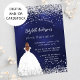 A modern, stylish and glamourous invitation for a 18th (or any age) birthday party. A navy blue background with faux glitter, sparkles, a girl wearing a ball gown. The blue colour is uneven. The name is written with a modern hand lettered style script. Personalise and add your party details.