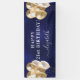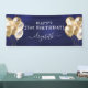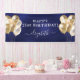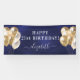 For a girly and glamourous 21st (or any age) birthday party. A navy blue background. The blue colour is uneven. Decorated with golden balloons. Personalise and add a name and age 21. White letters. The name is written with a modern hand lettered style script with swashes.
