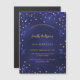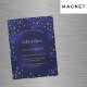 A magnetic birthday party invitation for both him and her. A navy blue background decorated with faux gold stars. The blue colour is uneven. Personalise and add a name and party details. Add year of birth and year of the celebration