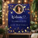 A welcome poster for a girly and glamourous 21st (or any age) birthday party. A navy blue uneven coloured background decorated with faux gold dripping stars. Personalise and add a name and age 21. Welcome with a heart. Add your photo inside the faux diamond frame.