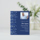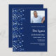 A modern, elegant and invitation. A navy blue background decorated with blue confetti. Personalise and add photo, a name and party details. White text.