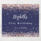 A navy blue background. Decorated with rose gold confetti. Personalise and add a name, age and the date. White text.