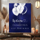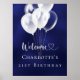 A welcome poster for a 21st (or any age) birthday party. A navy blue background with white balloons. The blue colour is uneven. Personalise and add a name and age 21. White letters.
