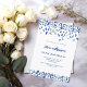 A modern, elegant and invitation. A white background decorated with blue confetti. Personalise and add a name and details. Blue text.