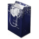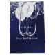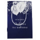 A gift bag for a girly and glamourous 21st (or any age) birthday. A navy blue background decorated with glitter sparkles and white balloons. The blue colour is uneven. Personalise and add a date, name and age 21. The text: The name is written in white with a modern hand lettered style script