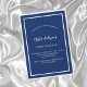 A modern, elegant and invitation. A navy blue background decorated with white frames. Personalise and add a name and details. White text.