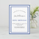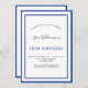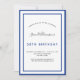 A modern, elegant and invitation. A white background decorated with navy blue frames. Personalise and add a name and details. Black and blue coloured letters.