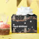 This wrapping paper roll is black covered in white stars with pretty brown owls sitting on tree branches wearing purple crystal necklaces. customise the Happy Birthday text with the template.