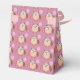 This awesome favour box features a cute brown owl with big sleepy eyes. The owl is holding a pretty pale pink balloon and a bouquet of bright pink flowers wrapped in a pale pink cone.