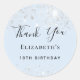 A sticker for a girly 10th (or any age) birthday party. A light blue, baby blue background with faux silver glitter dust. The text: Thank You is written with a large modern hand lettered style script. Personalise and add a name and age.