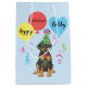 Happy birthday greetings with this cute design featuring a smiling, party hat-wearing Doberman Pinscher puppy surrounded by colourful balloons and streamers. “Happy Birthday, [name]” on front and “Happy Birthday to You!” on back. Name can be easily changed; just click on personalise button.