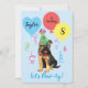 You're invited to a birthday Paw-ty with this cute, party hat-wearing German Shepherd puppy, surrounded by colourful balloons and streamers. Text can be easily personalised. Matching party supplies available.