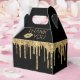 Elegant party favour box with yellow gold glitter drips on a black background with custom xoxo thank you text, and yellow glitter lips, perfect for a modern and chic birthday, bat mitzvah, Quinceañera, bridal shower, baby shower or bachelorette party. Use the Design Tool to change the fonts, colours and layout to create a fun and unique personalised favour box for your party guests guests.