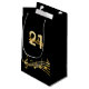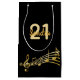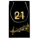 Cool and elegant black background with faux gold music notes for a 21st birthday. Templates for the age 21 and name. The name is written in a hand-lettered style script. Golden letters and number.