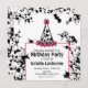 A birthday party invitation featuring an illustration of a party hat with black paint splatters and pink and black trim at top. Personalise the text below hat. Background is black paint splatters.