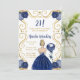 This birthday party invitation features an elegant gold frame, a beautiful princess with blonde hair and a navy blue dress, flowers and a balloon. This is perfect for a birthday party.