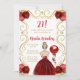 This birthday party invitation features an elegant gold frame, a beautiful princess with blonde hair and a red dress, flowers and a balloon. This is perfect for a birthday party.