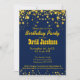 Modern and elegant birthday party invitation with rich dark gold glowing confetti glitter on a blue background.You can easily customise the text for any occasion.
