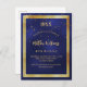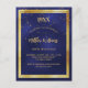 A dark blue, navy blue background. The blue colour is uneven. With a faux gold frame and golden confetti sprinkle, golden coloured letters. Personalise and add year of birth, name, party details.