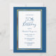 On front: A classic blue background with a faux goldand white frame. Simple and elegant! Templates for a name and party details. The name and the text: 50th (or any age) Birthday are written with a hand lettered style script, blue coloured letters. Perfect for a winter, spring or a nautical summer birthday party!