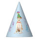 Happy birthday greetings with this cute design featuring a smiling, party hat-wearing Borzoi puppy surrounded by colorful streamers.