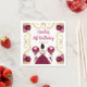 This birthday napkin features an elegant gold frame, a beautiful princess with brown hair and a burgundy red dress, flowers and a balloon. This is perfect for a birthday party.