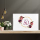 A Guest Book for a 50th (or any age) birthday party. A chic white background with a faux gold geometric frame. Decorated with dark purple and burgundy flowers, roses and boho style feathers. Templates for a name, age 50 and a date. Date of birth or the date of the party. The name is written with a hand lettered style script, pink colored letters, age in purple and the date with black numbers. Text on the spine.