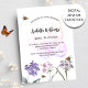 A white background on the front. Decorated with bees and painted wildflowers in violet and pink and a large butterfly. Personalise and add a name and party details.