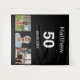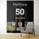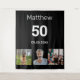 For a 50th (or any age) birthday party. A collage of 3 of your photos of himself friends, family, interest or pets. Personalise and add his name, age 50 and a date. Black background. Date of birth or the date of the birthday party. White coloured text.