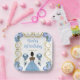 This birthday plate features an elegant gold frame, a beautiful princess with dark skin and a dusty blue dress, flowers and a balloon. This is perfect for a birthday party.