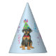 Happy birthday greetings with this design featuring a cute, party hat-wearing Doberman Pinscher puppy surrounded by colourful streamers.