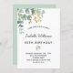 An elegant invitation for a 50th (or any age) birthday party. A chic white background. Decorated with green eucalyptus leaves, sprigs, greenery and a faux gold sprig. Personalise and the name and party details. Black letters.