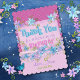 Beautiful birthday party "Thank You" card with pink, blue and violet watercolor flowers, green swirls and piece of parchment for your text, over purple and baby pink background with white polka dots. Cute, colourful, girly design, perfect for spring/summer floral themed birthday celebration.