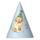 Happy birthday greetings with this cute design featuring a smiling, party hat-wearing Golden Retriever puppy surrounded by colourful streamers.