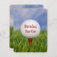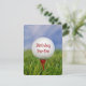 Close up of a white golf ball on red tee in grass for birthday party invitation. Can be used for any age.