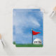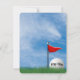Close up of a white golf ball in green grass with blue sky background for any age birthday party invitation.