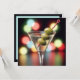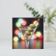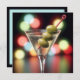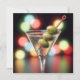 A martini glass filled with a clear cocktail is garnished with three green olives on a red skewer for an adult birthday party.