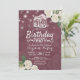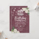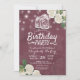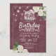 Birthday Party Invitation - Elegant Script, Mason Jars, Hydrangea Flowers and String Lights on Burgundy Red Floral Linen Background.